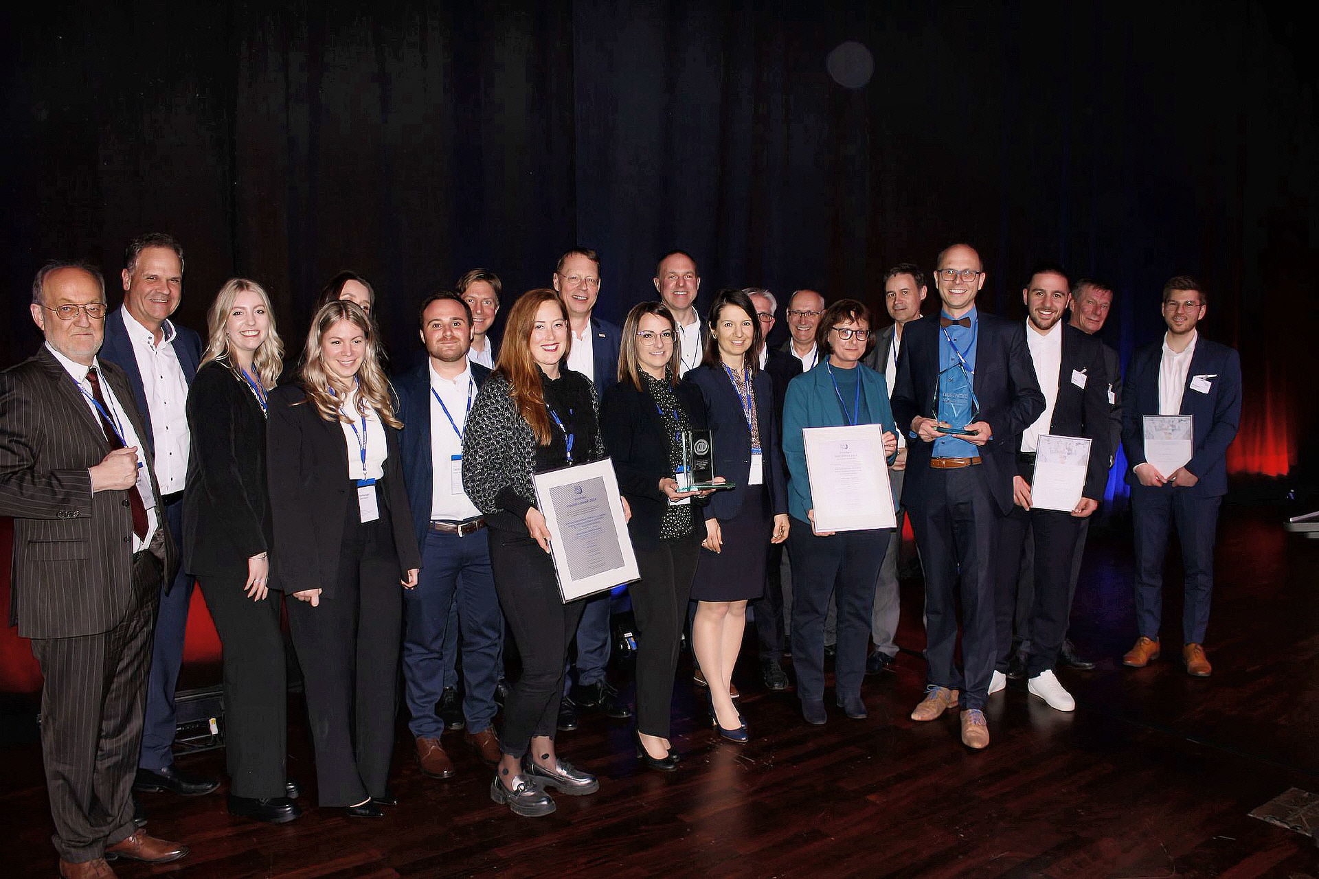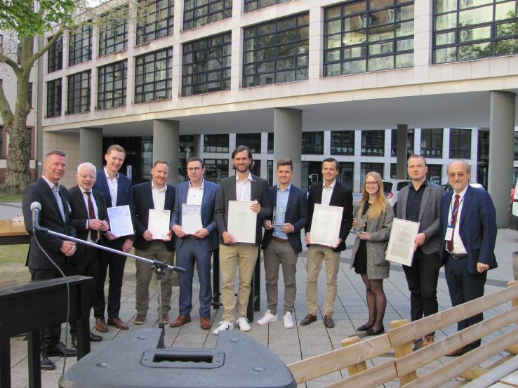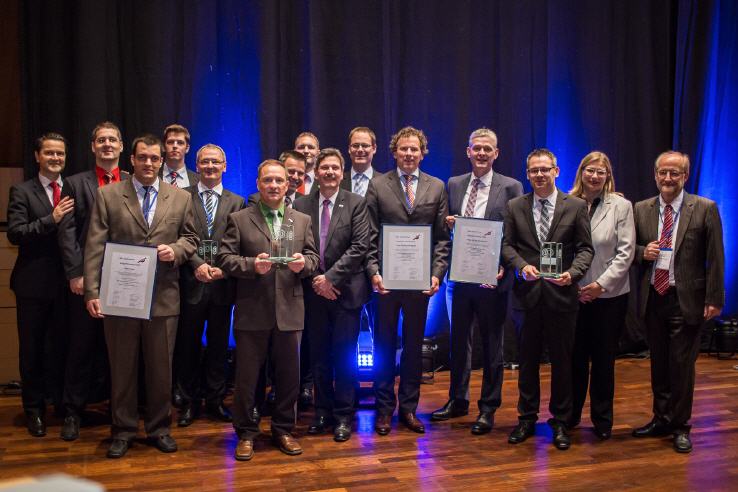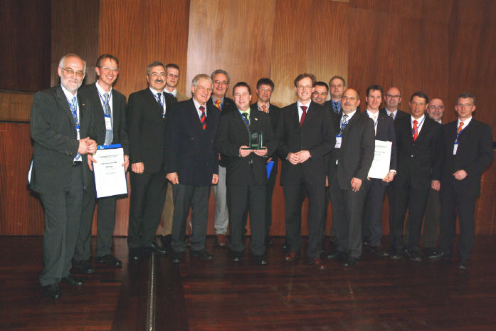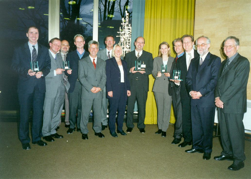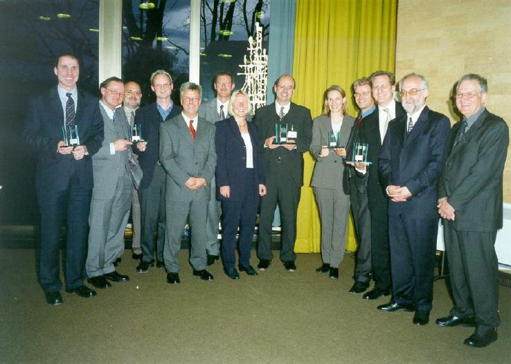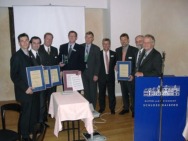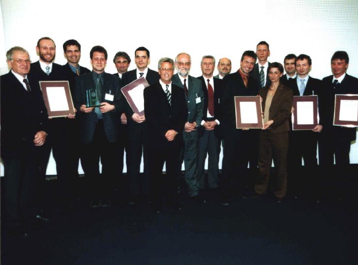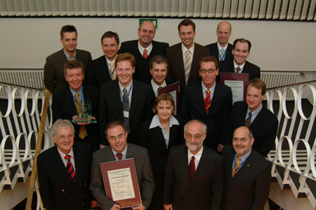 mit der Jury (v.l.n.r.) Prof. Dr. Klaus Huckert (HTW, Jury), Prof. Dr. Klaus-J. Schmidt (HTW, Jury), Adrian Klein (j&m, Jury), Achim Rauber (Geschäftsführer VDA), Albert Hettrich (Staatssekretär Ministerium für Wirtschaft und Arbeit), Horst Ritze (Ford, Jury), Rolf Haberlandt (AKJ/Daimler), Dr. Hanspeter Georgi (Vorstand Arbeitskreis Wirtschaft AKW), Udo Nießen (Geschäftsführer Inform, Hauptpreisträger), Björn Beckmann (Volkswagen/Audi, Hauptpreisträger), Alexandra Bräuer (Dräxlmaier, Preisträger), Lennard Keetz (Continental, Jury), Sven Hodinius (Daimler, Preisträger), Jürgen Delai (Daimler, Preisträger), Hans-Peter Gartner (Dräxlmaier, Preisträger), Herr Lindlau (POL, Preisträger), Herr Koehn (Daimler, Preisträger)