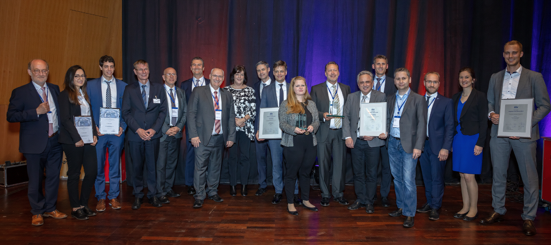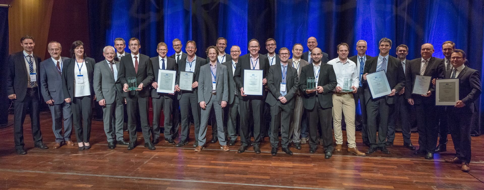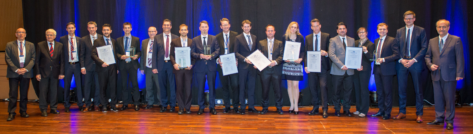 mit der Jury (v.l.n.r.) Prof. Dr. Klaus Huckert (HTW, Jury), Prof. Dr. Klaus-J. Schmidt (HTW, Jury), Adrian Klein (j&m, Jury), Achim Rauber (Geschäftsführer VDA), Albert Hettrich (Staatssekretär Ministerium für Wirtschaft und Arbeit), Horst Ritze (Ford, Jury), Rolf Haberlandt (AKJ/Daimler), Dr. Hanspeter Georgi (Vorstand Arbeitskreis Wirtschaft AKW), Udo Nießen (Geschäftsführer Inform, Hauptpreisträger), Björn Beckmann (Volkswagen/Audi, Hauptpreisträger), Alexandra Bräuer (Dräxlmaier, Preisträger), Lennard Keetz (Continental, Jury), Sven Hodinius (Daimler, Preisträger), Jürgen Delai (Daimler, Preisträger), Hans-Peter Gartner (Dräxlmaier, Preisträger), Herr Lindlau (POL, Preisträger), Herr Koehn (Daimler, Preisträger)