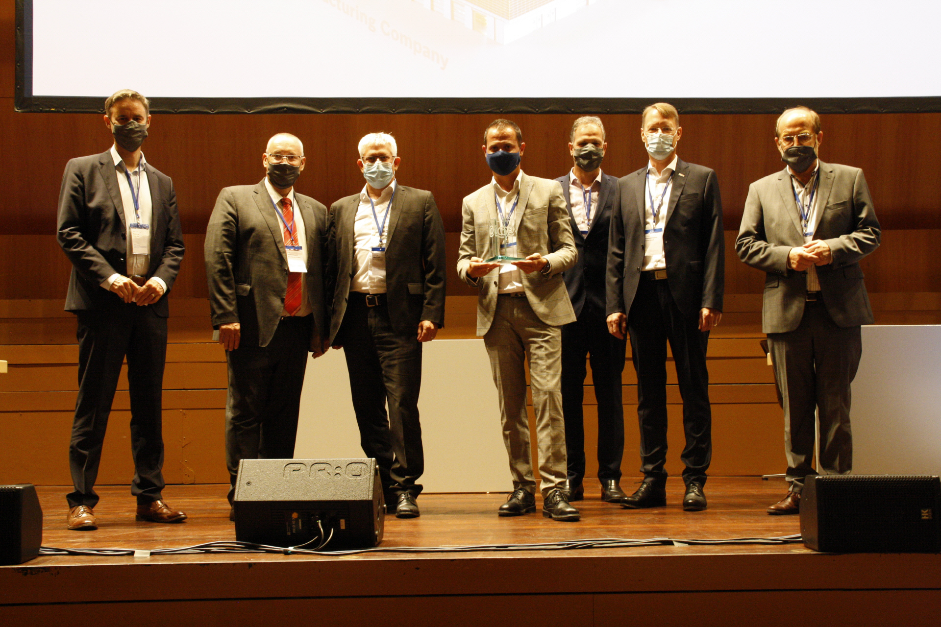 Preisträger elogistics award 2025 von Schmitz Cargobull, Motherson Hungary, dem Gewinner des ToolAward Magna mit S2 Data sowie den anwesenden Juroren, Dr. Dreher (BMW), Alexander Menzel (Bosch), Stefan Rosenwald (XRDT) und Prof. Schmidt (IPL/AKJ).