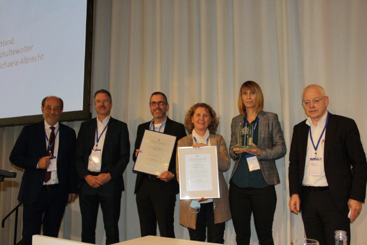 - mit der Jury im Festsaal der Kongresshalle. Klaus Rümler (gedas Mexico - Jury), Prof. Dr. Klepzig (FH Augsburg, Jury), Dr. Susanne Keller (prämiert in der Gruppe Dissertationen), Rudolf Werner (DaimlerChrysler - Jury), Prof. Dr. Schmidt (AKJ/IPL/HTW - Jury).