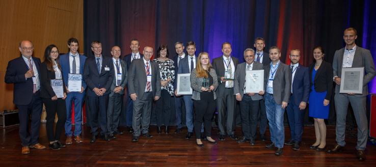 - mit der Jury im Festsaal der Kongresshalle. Die ausgezeichneten Unternehmen mit ihren beteiligten IT-Dienstleistern , Lear/KAT, Schnellecke/Logis und Volkswagen/Fraunhofer IML. Die Hauptpreisträger Bosch/ESKAPE